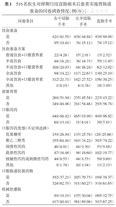 516名医生对择期行结直肠癌术后患者实施胃肠道准备的问卷调查情况[例(%)]