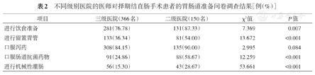 不同级别医院的医师对择期结直肠手术患者的胃肠道准备问卷调查结果[例(%)]