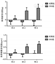 出院后30、60和90 d,检测两组患者人体测量指标,ONS组体质量和体质指数(body mass index,BMI)均增加,但对照组则有所下降;术后60 d和90 d,ONS组体质量和BMI变化值(治疗后减去出院时基线值)均较对照组显著改善(均P<0.05),见表2和图1。而上臂围、利手握力和三头肌皮褶厚度的变化值两组差异无统计学意义(均P>0.05)。
