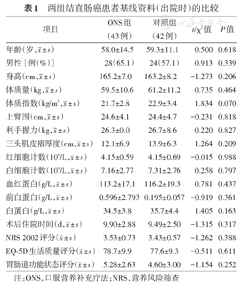 90例患者符合入组标准纳入研究,其中4例因随访期间依从性差由研究人员判定出组,1例因患者个人因素失访;最终85例完成研究,其中对照组42例,ONS组43例,两组患者出院时(基线)临床资料的差异均无统计学意义(P<0.05),具有可比性;见表1。
