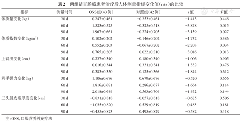 两组结直肠癌患者治疗后人体测量指标变化值(
