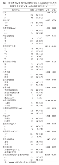 影响本组245例行新辅助放化疗直肠癌患者术后达到病理完全缓解(pCR)的单因素分析[例(%)]