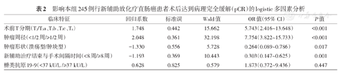 影响本组245例行新辅助放化疗直肠癌患者术后达到病理完全缓解(pCR)的logistic多因素分析