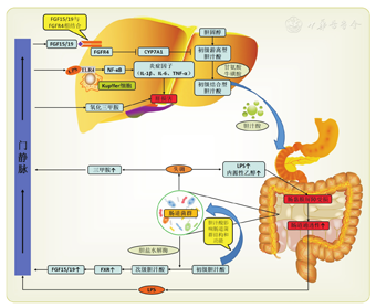 注:CYP7A1:胆固醇7α-羟化酶;FGF15/19:成纤维细胞生长因子15/19;FGFR4:成纤维细胞生长因子受体4;FXR:法尼酯X受体;IL-1β:白介素-1β;IL-6:白介素-6;LPS:内毒素;TLR4:Toll样受体4;TNF-α:肿瘤坏死因子-α
