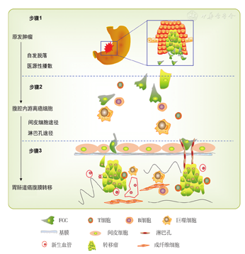 GICPM通常起源于腹腔内游离癌细胞(free cancer cell,FCC)的微转移,而FCC又有两个不同来源:(1)肿瘤侵袭的自然过程所导致的原发肿瘤细胞脱落;(2)手术切除肿瘤过程中,由于手术操作导致癌细胞的医源性扩散[5]。FCC可通过间皮细胞途径和(或)淋巴孔途径形成腹膜转移癌:(1)间皮细胞途径:部分FCC附着于腹膜间皮细胞后,释放细胞因子使间皮细胞骨架收缩,FCC通过间皮细胞间裂隙转移并侵入至间皮下,破坏腹膜屏障,增殖生长,形成有新生血管的转移瘤;(2)淋巴孔途径:FCC分泌的细胞因子使间皮细胞收缩,导致腹膜乳斑上的淋巴孔暴露,FCC直接通过淋巴孔迁移至间皮下淋巴管,增生并新生血管,形成转移瘤,见图1[6,7]。随着肿瘤从黏膜到浆膜的深度侵袭,腹腔细胞学中的FCC阳性率增加。腹膜转移癌患者的腹腔灌洗液(或腹水)内FCC阳性率达到93%~100%[8]。传统根治性手术不能根治FCC,这也是GICPM发生率高、预后差的主要原因[9]。