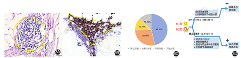 GICPM的形成也是"种子与土壤学说"的一种表现形式,在腹膜中这种特定"土壤"是一种称之为乳斑的淋巴样组织,见图3。该结构的基本细胞组成是巨噬细胞和各种表型的淋巴细胞,其中巨噬细胞是启动癌细胞侵袭乳斑的关键。