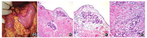 癌细胞一旦进入乳斑后,即开启快速发展的侵袭性生长模式。其主要表现为:(1)肿瘤细胞出现异质性变化,一部分细胞保持原有细胞形态,另一部分细胞出现上皮-间质转化的特征;(2)癌细胞迅速诱发周围的间质细胞转变为纤维细胞,出现持续进展的广泛腹膜纤维化过程;(3)该纤维化过程主要呈表面延伸性发展,但在小肠系膜缘往往出现深入潜掘式生长,迅速导致小肠系膜挛缩[13],见图4。这些病理特征的治疗学意义在于,必须采取一些局部的处理措施来减缓或终止该病理过程,尤其是通过创新性外科手段。