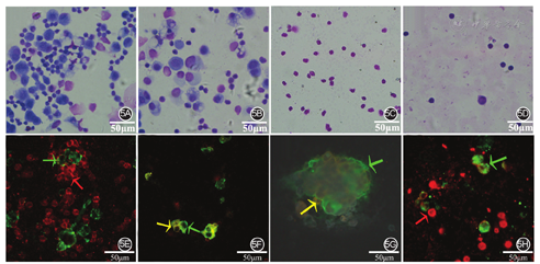 腹膜免疫微环境的动态变化,一直贯穿于GICPM病理发展的全过程。采用量子点标记探针技术,标记癌细胞及腹腔内各种关键免疫细胞,研究癌细胞与腹腔内免疫细胞的关系,发现随着癌细胞与免疫细胞数量比例关系的变化,腹腔内的免疫微环境逐步从免疫攻击型变为免疫容受型,腹膜免疫微环境不但失去了对癌细胞的抵抗作用,还越来越有利于癌细胞的侵袭性生长[14]。见图5。