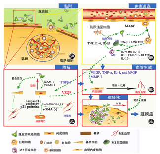 注:M-CSF:巨噬细胞集落刺激因子;TNF-α:肿瘤坏死因子α;IL:白细胞介素;IFN-γ:干扰素γ;LPS:脂多糖;IC:免疫复合物;TLR:Toll样受体;TGFβ-1:转化生长因子β1;ICAM-1:细胞间黏附分子-1;VCAM-1:血管细胞粘附分子-1;VEGF:血管内皮生长因子;a-SMA:a-血管平滑肌肌动蛋白;bFGF:碱性成纤维细胞生长因子;MMP-7:基质金属蛋白酶7;FCC:腹腔内游离癌细胞;GICPM:胃肠道癌腹膜转移
