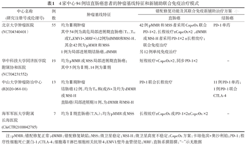 | 中心名称(研究注册号或伦理号) | 例数 | 肿瘤基线特征 | 错配修复功能及其联合免疫新辅助治疗方案 | |