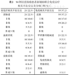 94例结直肠癌患者新辅助联合免疫治疗相关不良反应及分级[例(%)]