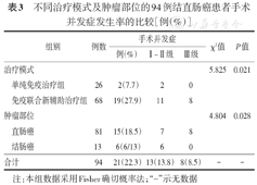 不同治疗模式及肿瘤部位的94例结直肠癌患者手术并发症发生率的比较[例(%)]