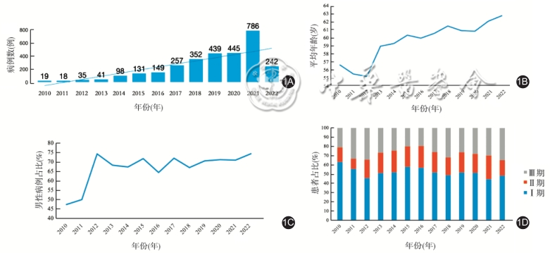 本中心腹腔镜胃癌根治手术量逐年增加(y=47.505x,R2=0.67),见图1A。随着时间推移,行腹腔镜胃癌手术患者的年龄逐渐增加,从2012年的平均55.1岁增加至2022年3月的62.8岁,见图1B。除2010年外,其他年份行腹腔镜胃癌手术患者中,男性患者占比较高,其比例从2012年至2022年3月稳定于70%左右,见图1C。从病理分期来看,Ⅰ期患者占比虽有波动,但随时间推移呈现波动式下降趋势,见图1D,而Ⅲ期患者比例略有增加,目前占比34%。