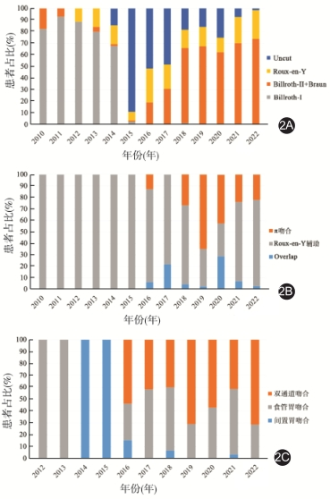 按手术年份和各消化道重建方式的占比进行比较,发现在开展腹腔镜远端胃切除术初期以Billroth-Ⅰ吻合占比较高。2014年率先行Uncut吻合方式,2015年Uncut吻合占比近90%。近年的远端胃切除后消化道重建方式侧重于Billroth-Ⅱ+Braun吻合,见图2A。整体来看,全胃切除术后的吻合方式仍以辅助Roux-en-Y为主:从2016年开始,π吻合和Overlap吻合数量逐渐增加,其中π吻合于2019年达到最高占比,Overlap吻合于2020年达到最高占比,见图2B。近端胃切除术后的吻合方式最初为食管-胃空肠吻合,随后增加了间置胃吻合方式,2016年以来,近端胃切除术后吻合方式以双通道和食管胃吻合方式为主,两者比例近似,见图2C。