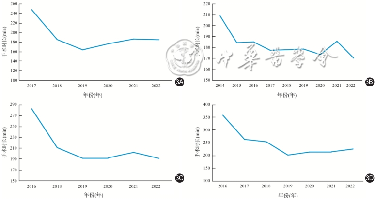 以手术年份为横坐标,根据不同吻合方式分别进行手术时间分析,其中远端胃切除Uncut吻合的手术时间逐年缩短,并于2017年达到平稳(此时累计病例数为199例),见图3A;远端胃切除Billroth-Ⅱ+Braun吻合的手术时间长于2019年达到平稳(此时累计病例数为158例),见图3B;全胃切除π吻合于2019年降低至平稳(此时累计病例数为117例),见图3C;全胃切除Overlap吻合于2019年达到平稳(此时累计病例数为32例),见图3D。