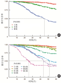 中位随访时间为29.5个月,全组患者整体5年生存率为74.7%;其中Ⅰ、Ⅱ、Ⅲ期患者5年生存率分别为 92.0%、77.2%和40.3%,见图4A。进一步按照TNM分期进行分组,患者ⅠA、ⅠB、ⅡA、ⅡB、ⅢA、ⅢB和ⅢC期5年生存率分别为93.2%、87.8%、81.1%、72.7%、46.2%、37.1%和34.0%,见图4B。