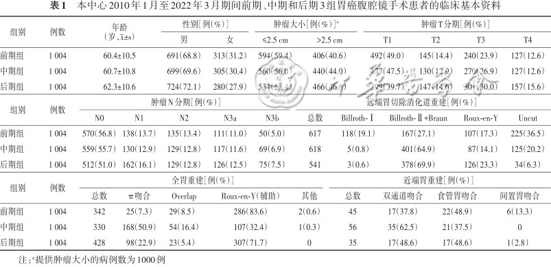 本中心2010年1月至2022年3月期间前期、中期和后期3组胃癌腹腔镜手术患者的临床基本资料