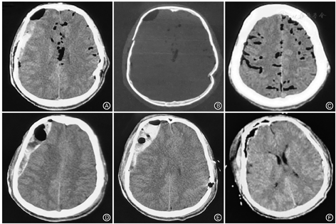 本例特殊之处为颅内积气减少而迟发硬膜外积气增多并呈张力性,术中未见硬膜破裂,硬膜外气体来源考虑因患者年轻,硬膜与颅骨粘连不紧密,外伤后硬膜与颅底撕脱形成间隙,气体在患者躁动大喊时经颅底骨折缝隙进入颅内,部分气体经颅底与硬膜外间隙达硬膜外,形成硬膜外积气。