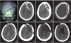 术后第2天,意识呈昏睡状,GCS为9分,呼唤能睁眼,无发音,刺痛能定位。拨气管插管及硬脑膜外引流。术后第3天,因发热加用丁胺卡那针0.6 g/d,术后第6天,因并发肺炎高热不退,停用罗氏芬针,抗生素改用哌拉西林他唑巴坦针13.5 g/d治疗。术后第10天,意识呈嗜睡状,GCS为10分,自动睁眼,无发音,刺痛能定位。反应迟钝,伤口愈合甲级。丁胺卡那针和哌拉西林他唑巴坦针各自用12 d。术后第3周意识转清,能吃流质,存在运动性失语和四肢瘫(肌力3级),行高压氧、针灸等康复治疗。术后第5周,能吃半流质,反应迟钝,仍运动性失语,左侧肢体肌力4级,右侧3级;能扶下床活动,骨窗塌陷,颈软,无发热。术后第6周转康复科治疗。于术后第8周出现持续高热,颈抵抗++,骨窗膨出,腰椎穿刺脑脊液化验示白细胞120个/μl,头颅MRI增强示无脑脓肿。证实颅内感染明确。静脉滴注利奈唑胺针1.2 g/d+美罗培南针4 g/d,10 d后体温控制正常,至临床表现正常且连续隔天3次腰椎穿刺脑脊液化验正常才停抗生素,总疗程8周。半年后随访:意识清,仍部分运动性失语,智力减退,生活部分自理,四肢肌力4级,肌张力高,骨窗塌陷,无癫痫发作史。