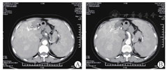 上腹部CT增强扫描:遗传性出血性毛细血管扩张症(肝动脉-门静脉瘘),肝硬化,脾大,门静脉高压,门静脉右支局限性瘤样扩张,少量腹腔积液(图2)。