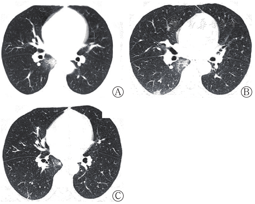 研究纳入病例中26例(81.25%)接受了胸部X线计算机断层摄影术(CT)检查。1例41岁男性新型冠状病毒肺炎确诊病例,入院CT结果提示:右肺下叶后基底段胸膜下磨玻璃样结节与实变混合病灶(图1A);6 d后复查提示病灶进展,表现为面积增大且部位增多(图1B);经积极的支持治疗和抗病毒治疗,13 d后复查CT提示病灶基本吸收,残留少许条索灶(图1C)。其余病例均提示较为典型的新型冠状病毒肺炎影像学表现[5]:两肺多发斑片状磨玻璃阴影、实变影,多沿支气管血管束和胸膜下分布为主,其间可见增粗的血管影,表现为细网格状影,呈"铺路石征" 。也可以表现为极为淡薄的磨玻璃阴影,小血管周围有局限性磨玻璃阴影。