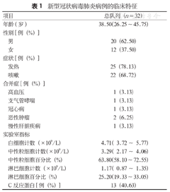 研究回顾性纳入了7家新型冠状病毒感染定点医院自2020年1月23日至2020年2月8日连续收治,且符合纳排标准的32例确诊病例。其中,22例(68.75%)为输入性病例,10例(31.25%)为2代病例。研究纳入病例的临床特征包括:中位年龄38.50(26.25~45.75)岁,男性患者20例(62.50%),女性患者12例(37.50%)。主要临床表现:发热25例(78.13%),咳嗽22例(68.72%)。4例(12.50%)患者合并有1项基础疾病(支气管哮喘、冠心病、恶性肿瘤、慢性肝脏疾病各1例),1例(3.13%)患者同时合并有高血压和恶性肿瘤。实验室检查提示,白细胞计数、中性粒细胞百分比、淋巴细胞百分比的中位值分别为:4.71×109/L(3.72×109/L~5.77×109/L)、63.80%(58.10%~72.55%)和25.20%(19.33%~33.05%)。13例(40.63%)患者C反应蛋白升高(> 10 mg/L),见表1。
