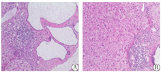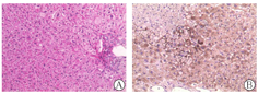 注:A:HE染色,肝小叶结构完整,肝板排列较整齐,肝小叶内少数点、灶状坏死,肝细胞普遍肿胀,部分呈气球样变,未见淤胆及胆栓,汇管区见少量淋巴细胞浸润 HE×100;B:HBsAg免疫组织化学结果DAB×100