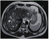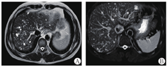 注:A:肝内见多发T2WI高信号影,大小不等,大者长径约23 nm,部分簇状分布,形似"满天星";B:左肾类圆形T2WI高信号影