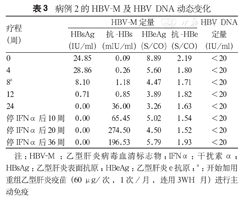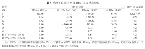 病例2继续口服TDF(300 mg/d;购自葛兰素史克公司),并加用Peg-IFNα-2b(180 μg/次,皮下注射,1次/周;购自厦门特宝生物工程股份有限公司)治疗。治疗24周时获得HBsAg血清学转换,但HBeAg仍阳性(3.26 S/CO)。此时,患者出现了IFNα诱发的甲状腺功能亢进症,甲状腺功能系列显示:游离T3 7.68 pmol/L,游离T4 30.84 pmol/L,总T3 3.86 nmol/L,总T4 255.80 nmol/L,促甲状腺素0.02 μIU/ml。经内分泌科诊治后建议患者停用IFNα,同时予以甲巯咪唑治疗甲状腺功能亢进症。患者停用IFNα后继用TDF治疗。停用IFNα 20周后甲状腺功能恢复正常。HBV-M及HBV DNA动态变化见表3。
