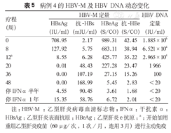 病例4单用Peg-IFNα-2b(90μg/次,皮下注射,1次/周)治疗。治疗20周时获得HBsAg血清学转换,但HBeAg(227.28 S/CO)和HBV DNA(1 966 IU/ml)均阳性,继续治疗至48周时,HBV DNA不可测,但HBeAg(5.45 S/CO)仍阳性,考虑Peg-IFNα-2b治疗疗程已满48周,遂停用。HBV-M及HBV DNA动态变化见表5。