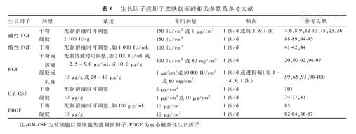 | 碱性FGF | 干粉 | 配制溶液时可调整 | 150 IU/cm2或1 μg/cm2 | 1次/d或每2天1次 | 4-6,8-9,12-13,15,23,26 |