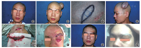 2012年5月—2016年7月,笔者单位收治单侧眉毛完全缺损患者11例、单侧眉毛部分缺损患者2例,其中男8例、女5例,年龄17~42岁。致伤原因:热水烫伤7例、热油烫伤4例、火焰烧伤2例。患者眉毛缺损处均可见瘢痕。