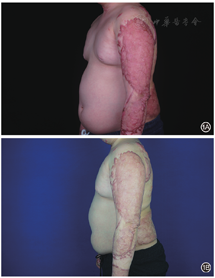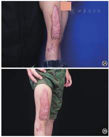 例1 男,16岁,火焰烧伤左上肢及背部,烧伤总面积9%TBSA,深Ⅱ度,患肢烧伤面积5%TBSA。伤后2个月瘢痕增生明显,质硬、充血明显,见图1A。治疗前患儿左上肢瘢痕视觉模拟评分为8分重度瘙痒;四项目瘙痒量表中瘙痒部位1分,瘙痒程度4分,瘙痒频率3分,睡眠影响2分。应用窄谱强脉冲光和点阵二氧化碳激光联合治疗后3个月,患儿左上肢瘢痕增生减弱,质地变软,充血减轻,平整度改善,见图1B;视觉模拟评分为5分中度瘙痒;四项目瘙痒量表中瘙痒部位1分,瘙痒程度2分,瘙痒频率1分,睡眠影响1分;瘢痕明显改善(改善度为51%~75%),患者对瘢痕瘙痒治疗相当满意(满意度为51%~75%),未见不良反应。