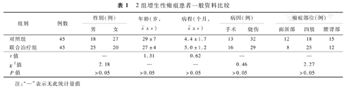 2017年3—12月,笔者单位按照入选标准纳入90例患者,其中男43例、女47例,年龄16~43(28±6)岁,手术后瘢痕29例、烧伤瘢痕61例,病程2.7~6.2(4.8±0.3)个月。瘢痕部位:面颈部20例、四肢43例、腰背部27例。采用随机数字表法将患者分为联合治疗组和对照组,每组45例。2组患者性别、年龄、病程、病因、瘢痕部位比较,差异均无统计学意义(P>0.05),见表1。