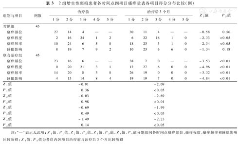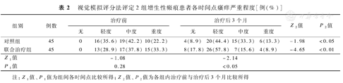 治疗前,2组患者瘢痕视觉模拟评分法评定的瘙痒严重程度分布差异均无统计学意义(P>0.05);治疗后3个月,对照组、联合治疗组患者瘢痕视觉模拟评分法评定的瘙痒严重程度均较组内治疗前明显减轻(P<0.05或P<0.01),联合治疗组患者视觉模拟评分法评定的瘙痒严重程度明显轻于对照组(P<0.05)。见表2。