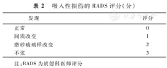 床旁胸部X线、胸部CT及超声等检查是临床诊断吸入性损伤、评估病情的重要辅助措施。早期床旁胸部X线和胸部CT检查均可能为阴性,若早期渗出明显,预示着预后不良。放射科医师评分(radiologist′s score,RADS:1 cm层厚的胸部CT上每1/4象限最高评分总和,表2)指出,高RADS评分(每个层面>8分)可作为FOB结果的有力补充,有助于提高临床吸入性损伤的诊断率和严重程度判读率[6]。