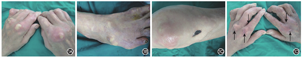 因高热,入院后第2天在蛛网膜下腔-硬膜外联合麻醉下行左膝部、左下肢内侧扩创及VSD治疗,术中见大量脓液溢出,痛风结石广泛沉积于深筋膜等结缔组织中,沿肌间隙及肌肉表面蔓延,部分肌纤维、骨质内也可见痛风结石附着,彻底清除痛风结石及周围活性欠佳的组织,将敷片填塞创腔,行持续VSD,压力-13.3 kPa。术后行抗感染及对症治疗。嘱患者低嘌呤糖尿病饮食,口服碳酸氢钠碱化尿液,鼓励其多饮水。监测并控制血糖,给予门冬胰岛素皮下注射治疗。因术后高热,入院后第8天行VSD敷片更换术,术中见左小腿创面残留脓性分泌物,术后连续5 d患者无高热。入院后第13天行左下肢内侧再次扩创及VSD敷片更换术,术后第4天,患者出现柏油样大便伴血压下降,急查血常规示红细胞计数1.93×1012 /L,血红蛋白56 g/L。胃镜检查示胃后壁约4 cm×3 cm溃疡,诊断为:急性上消化道大出血,失血性贫血,失血性休克。予以禁食,抑酸护胃及紧急输血,补充血容量等治疗,在ICU加强治疗5 d后转回笔者科室。患者继续高热达39 ℃以上,每次持续2~3 d,发热时伴全身多处关节痛风结石处皮肤红肿。因发热原因不明确,怀疑体表其他部位的痛风结石并发感染所致,对双手等部位有波动感的痛风结石予切开引流,未见脓液存在,用磺胺嘧啶银霜凡士林纱布包扎治疗,隔日换药,入院后第20天,双手切开部位的创面逐渐愈合,而患者高热仍未随创面愈合而消退。见图1。多次血微生物培养及真菌β-葡聚糖测定结果呈阴性,考虑可能存在肺部感染,行利奈唑胺(挪威Fresenius Kabi Norge AS公司,每12小时1次,每次0.6 g)联合比阿培南(购自江苏正大天晴药业股份有限公司,每8小时1次,每次0.3 g)抗感染治疗6 d,双肺CT平扫示右肺下叶背段及后基底段纤变灶。患者继续高热,发热原因始终不明,再次行胸腔、腹腔影像学及超声检查均未观察到感染灶,双膝MRI示髌骨、股骨外侧髁、胫骨平台骨髓水肿;半月板、交叉韧带损伤,左右小腿及膝关节周围软组织肿胀,肌间隙积液,筋膜及滑膜水肿。类风湿因子、结核抗体及血液疟原虫检查结果均为阴性。每次高热后,行双氯芬酸钠栓(湖北四环制药有限公司,每次50 mg)或赖氨匹林(安徽丰原药业股份有限公司,每次0.9 g)和/或地塞米松磷酸钠(湖北天药药业股份有限公司,每次5 mg)对症解热治疗仅能维持1~2 d的体温正常。患者除高热外其他生命体征平稳,多次手术治疗逐步修复创面。入院后第23天行左小腿内侧伤口缝合术及VSD敷片更换术,左大腿中厚皮片移植修复左膝内侧及左小腿中上部创面。入院后第36天行左大腿中厚皮片移植修复左膝外侧创面及局部皮瓣修复左小腿跟腱暴露创面。入院后第53天,患者左膝外侧及左下肢内侧开放性创面完全治愈,但高热仍持续。见图2、图3。由于病情迁延,高热原因始终不明,给予口服醋酸泼尼松片(天津力生制药股份有限公司,每次5.0 mg,每天1次)起始治疗,患者体温在用药5 d后恢复正常,之后继续口服小剂量醋酸泼尼松片(每次2.5 mg,每天1次)维持治疗,患者高热未再发,同时加强营养支持,口服非布司他片(杭州朱养心药业有限公司,每次40 mg,每天1次)降尿酸治疗,全身体表皮肤完整无破溃。其间患者行双下肢康复治疗,住院104 d痊愈出院,出院时体温正常,患者在轮椅上能吃饭、穿衣等,基本生活自理。出院后嘱定期随访风湿病专科。