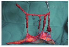 1988年美国学者Kroll和Rosenfield[24]首先使用了"perforator-based flap"的名称,这是最早对穿支皮瓣命名的文献,随后有学者连续发表了多篇有关"perforator-based flap"的论文[25,26,27]。真正的穿支皮瓣即perforator flap是在美国医师Allen和Treece[28]于1994年发表的《腹壁下动脉穿支皮瓣再造乳房》一文中提出的,对穿支皮瓣的发展推广具有很大促进作用。后来Angrigiani等[29]介绍了胸背动脉穿支皮瓣,Allen和Tucker[30]介绍了臀上动脉穿支皮瓣,紧接着Kimura和Satoh[31]报道了显微削薄穿支皮瓣。2001年根特会议召开,后来根据会议精神发表了穿支皮瓣命名共识[32],引起世界学者的广泛重视,对穿支皮瓣的研究起到了很大的推动作用。2009年在东京举行了穿支螺旋浆皮瓣专题研讨会,重点讨论了带蒂穿支螺旋桨皮瓣(perforator pedicled propeller flap)的命名,最终达成东京共识[33];同年Saint-Cyr等[34]以单穿支灌注,观察到单一穿支血管通过邻近链状血管为紧邻的第二穿支营养区域供血,即穿支血管所能支配的最大范围,提出穿支体区(perforasome)概念,该概念其实是指穿支的临床供区(clinical territory)。后来Taylor等[35]对穿支体区和血管体区进行了详细讨论。2011年Hallock[36]提出了特殊类型穿支皮瓣的命名方法,包括联体穿支皮瓣、嵌合穿支皮瓣、穿支血流桥接皮瓣等及其各种组合拼装形式,为特殊类型穿支皮瓣的临床应用奠定了基础。2013年出版了穿支皮瓣英文专著《穿支皮瓣的解剖、技术和临床应用》第2版。至此,穿支皮瓣的各种概念日趋规范、特殊类型穿支皮瓣的分类逐渐完善、穿支皮瓣专著陆续出版并逐渐普及,可见穿支皮瓣的发展已基本成熟。