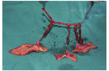 根据穿支血管来源,可将穿支皮瓣分为直接皮穿支皮瓣、肌间隔(隙)穿支皮瓣、肌皮穿支皮瓣、特殊类型穿支皮瓣,其中特殊类型穿支皮瓣包括血流桥接穿支皮瓣、分叶穿支皮瓣、联体穿支皮瓣、嵌合穿支皮瓣、削薄穿支皮瓣、其他特殊类型穿支皮瓣,而其他特殊类型穿支皮瓣又包括扩张穿支皮瓣、预构穿支皮瓣等。基础解剖研究和临床应用经验显示,一般来说穿支蒂部长度和直径具有如下规律:直接皮穿支皮瓣<肌间隔(隙)穿支皮瓣<肌皮穿支皮瓣,解剖难度具有如下规律:直接皮穿支皮瓣<肌间隔(隙)穿支皮瓣<肌皮穿支皮瓣<特殊类型穿支皮瓣。如果有2组及以上穿过深筋膜的动静脉支配同一瓣部,则该皮瓣不属于典型穿支皮瓣,属于共同源血管的联体穿支皮瓣;如果切取了轴型动脉上所有穿支,且所有穿支与受区血管进行了吻合,则瓣部由多个解剖学供区构成,与传统轴型皮瓣一致,此时已不是典型穿支皮瓣,而是联体穿支皮瓣的极端情况,属于传统轴型皮瓣(图1)。如果对该皮瓣行分叶则是分叶穿支皮瓣(图2),如果有2条独立Ⅰ级穿支则属于独立Ⅰ级穿支联体穿支皮瓣;如果穿支皮瓣携带了其他组织,比如肌肉、骨、筋膜等,则称作嵌合穿支皮瓣。