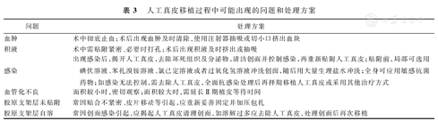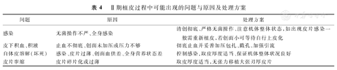 人工真皮使用时若操作不当会导致感染、植皮不成活等后果(表2)。目前人工真皮移植、Ⅱ期植皮过程中可能遇到的问题及解决措施见表3、表4。