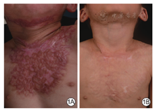 例1 男,2岁,颏、颈、前胸部沸水烫伤创面愈合后1.5个月,瘢痕凹凸不平、色红、质硬伴瘙痒。PDL治疗参数如下:能量密度6.0 J/cm2、光斑直径10 mm、脉冲宽度1.5 ms,光斑不重叠。患儿瘢痕治疗后即刻有轻微紫癜反应,无水肿水疱。UFCL治疗参数:Deep FX能量40.0~50.0 mJ、频率300 Hz、密度5%,光斑不重叠,扫描1次。首次联合治疗前POSAS医师评分:血管分布9分、色素沉着8分、厚度6分、凹凸程度8分、柔软度8分、表面范围7分、总体评价8分,患儿家属评分:疼痛6分、瘙痒8分、颜色9分、硬度8分、厚度6分、形状7分、总体评价8分。2次联合治疗后6个月,瘢痕平软、颜色接近正常皮肤、无瘙痒,POSAS医师评分:血管分布1分、色素沉着2分、厚度3分、凹凸程度3分、柔软度3分、表面范围3分、总体评价3分,患儿家属评分:疼痛1分、瘙痒2分、颜色1分、硬度2分、厚度2分、形状3分、总体评价2分。治疗过程中无不良反应,医患双方均表示非常满意。见图1。