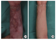 例2 女,3岁,左前臂沸水烫伤创面愈合后1个月,瘢痕凹凸不平、色红、质韧伴瘙痒、疼痛。PDL治疗参数如下:能量密度6.0 J/cm2、光斑直径10 mm、脉冲宽度1.5 ms,光斑不重叠。患儿瘢痕治疗后即刻有轻微紫癜反应,无水肿水疱。UFCL治疗参数:Deep FX能量30.0~ 40.0 mJ、频率300 Hz、密度5%,光斑不重叠,扫描1次。首次联合治疗前POSAS医师评分:血管分布8分、色素沉着7分、厚度6分、凹凸程度7分、柔软度8分、表面范围7分、总体评价8分,患儿家属评分:疼痛7分、瘙痒8分、颜色9分、硬度7分、厚度6分、形状7分、总体评价8分。2次联合治疗后6个月,瘢痕平软、颜色接近正常皮肤、无瘙痒疼痛,POSAS医师评分:血管分布2分、色素沉着2分、厚度3分、凹凸程度4分、柔软度3分、表面范围3分、总体评价3分,患儿家属评分:疼痛2分、瘙痒3分、颜色2分、硬度2分、厚度2分、形状3分、总体评价3分。治疗过程中无不良反应,医患双方均表示非常满意。后期仍继续治疗改善瘢痕。见图2。