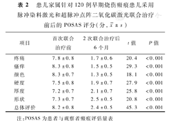 2016年1月—2019年12月,湖南省人民医院收治符合入选标准的120例早期烧伤瘢痕患儿,采用单组病例对照研究对其资料进行回顾性分析。患儿中男78例、女42例,年龄(4.2±0.8)岁,瘢痕面积(100.3±0.7)cm2。首次治疗采用PDL联合UFCL治疗,随后PDL每次治疗间隔1个月,UFCL每次治疗间隔3个月。总治疗周期为6个月,共行2次PDL单独治疗、2次联合治疗。首次联合治疗前、2次联合治疗后6个月,采用患者与观察者瘢痕评估量表(POSAS)对医师和患儿家属进行疗效评估。2次联合治疗后6个月,统计患儿家属疗效满意度并计算总体满意率。记录整个治疗过程中的不良反应情况。对数据行配对t检验。