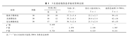 2017年6月—2018年12月,笔者单位收治90例符合入选标准的重症烧伤患者,纳入本前瞻性随机对照研究。采用随机数字表法将患者分为银离子敷料组、无菌敷贴组、安尔碘敷料组,每组30例。3组患者临床资料比较,差异无统计学意义(P>0.05),见表1。