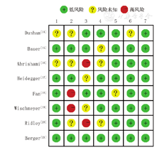 注:1.随机序列产生的方法是否正确,2.是否做到了分配隐藏,3.是否对参与者和实施者实施盲法,4.结果测量过程中是否使用盲法,5.资料是否完整,6.是否完整报告所有结局指标,7.是否存在其他偏倚风险