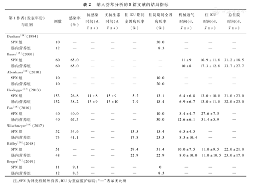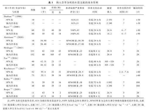 纳入的8篇文献中共有794例患者,包括接受SPN联合肠内营养治疗的SPN组患者387例和仅接受肠内营养的肠内营养组患者407例,年龄40.1~67.5岁,营养支持启动时间均为入住ICU 7 d内,营养支持治疗时间多为7 d,急性生理学和慢性健康状况评价Ⅱ(APACHEⅡ)评分为17.00~25分。8篇文献的基本信息、结局指标分别见表1、表2。