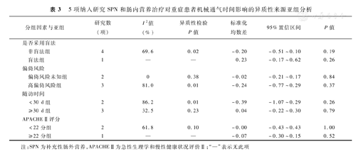 5项纳入研究SPN和肠内营养治疗对重症患者机械通气时间影响的异质性来源亚组分析