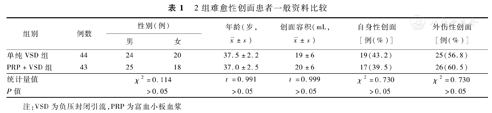 单纯VSD组中19例患者创面由自身疾病或营养因素造成,包括糖尿病创面9例、窦道创面5例、静脉性溃疡3例、压疮创面2例;25例患者由外伤因素造成,包括交通伤10例、烧伤9例、其他6例。PRP+VSD组中17例患者创面由自身疾病或营养因素造成,包括糖尿病创面10例、窦道创面3例、静脉性溃疡3例、压疮创面1例;26例患者中由外伤因素造成,包括交通伤10例、烧伤10例、其他6例。2组患者一般资料比较,差异无统计学意义(P>0.05),见表1。