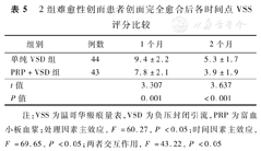 创面完全愈合后2个月PRP+VSD组患者较单纯VSD组瘢痕色素沉着更浅、厚度更低、柔软度好、肉眼看不到明显血管分布。PRP+VSD组患者创面完全愈合后1、2个月VSS评分显著低于单纯VSD组(P<0.01)。见表5。
