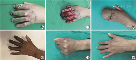临床上过去常采用腹部带蒂皮瓣移植修复手部Ⅳ度烧伤,因腹部供区相对隐蔽,患者易接受。根据手指伤情,灵活选用、适当裁剪的腹部带蒂皮瓣可以一次手术修复多指的多处创面,这种传统手部创面修复方法,目前在临床上仍然具有不可替代的作用[8, 9, 10, 11]。根据本课题组临床实践,多个手指创面清创后先行并指,再采用腹部带蒂皮瓣一起修复,断蒂时或断蒂后一段时间再行分指和皮瓣反取皮回植,能获得比较满意的功能与外观。当患手存在多指多处创面又不能行并指用一个皮瓣修复时,可采用腹部分叶皮瓣或多个腹部带蒂皮瓣修复,也可获得比较理想的修复效果。